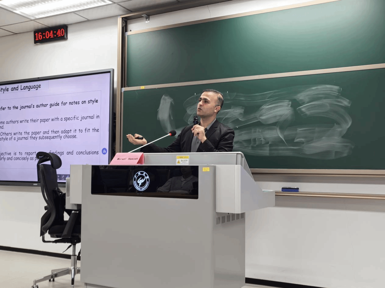 10月23日下午,学生第二党支部“灯塔菁英 照我远航”聚焦高质量学术成果系列活动在大学城校区文渊楼204顺利举行。本次活动邀请特聘教授Moradi Hamzeh(汉斯)博士担任主讲,以“Navigating the Path to Publication: Essentials of Research Writing”《学术发表指南:研究论文写作要领》为题,为同学们带来了一场内容丰富、视角前沿的学术写作指导讲座。