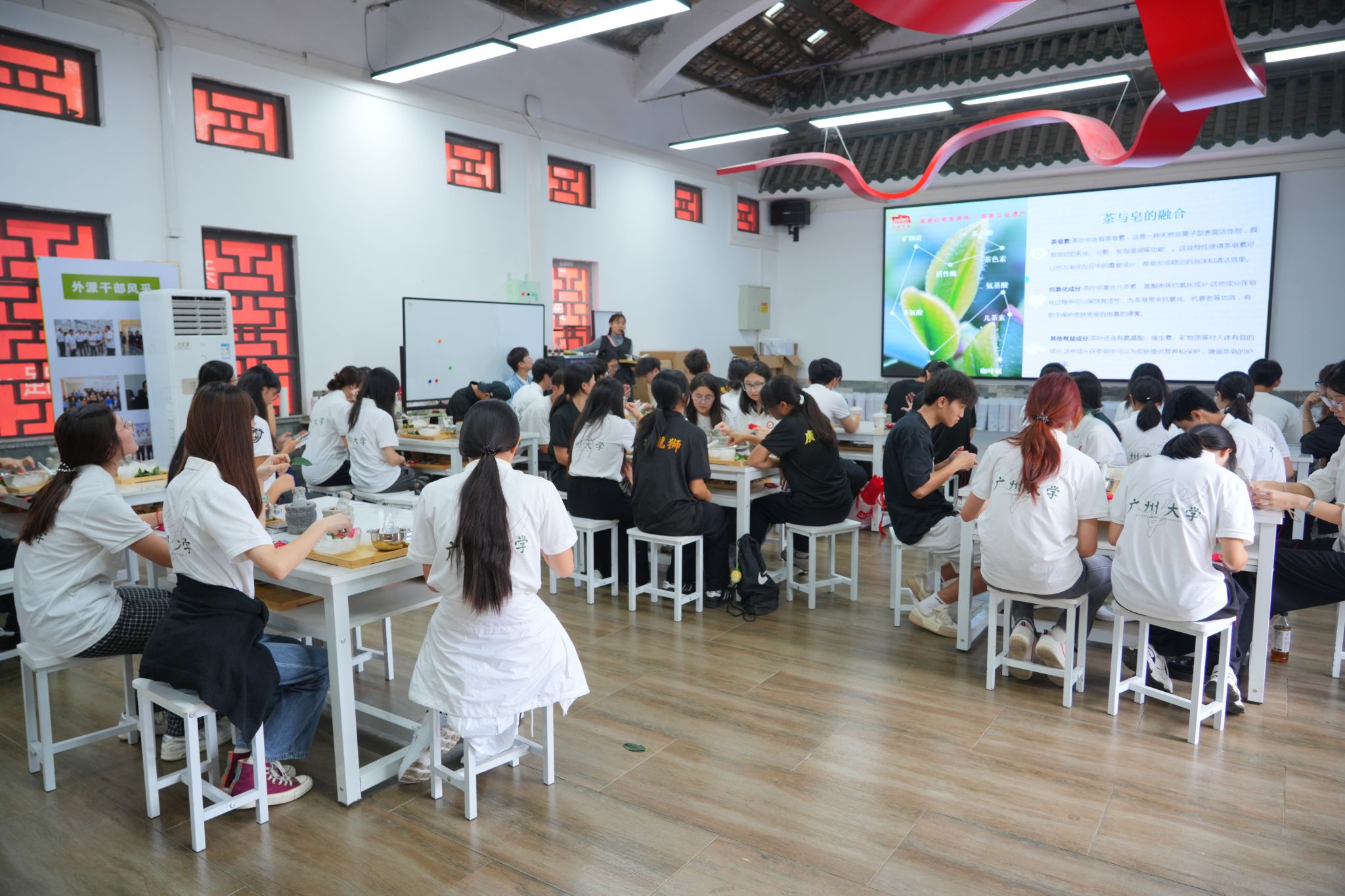 11月7日下午,师生一行走进红旗茶厂,系统了解英德红茶的传统工艺与智能化创新,感受百亿茶产业的文化底蕴与发展活力。学生们通过亲自参与茶香包、茶皂制作,在劳动体验中深化对乡村产业振兴的认知。在客家古村落梅子寨,学生一行开展入户走访与田野调查,详细了解当地在产业发展、文旅融合与人居环境整治等方面的成果与挑战,积极将专业所学融入社会所需、服务基层发展,以实际行动践行“把论文写在祖国大地上”的使命担当。