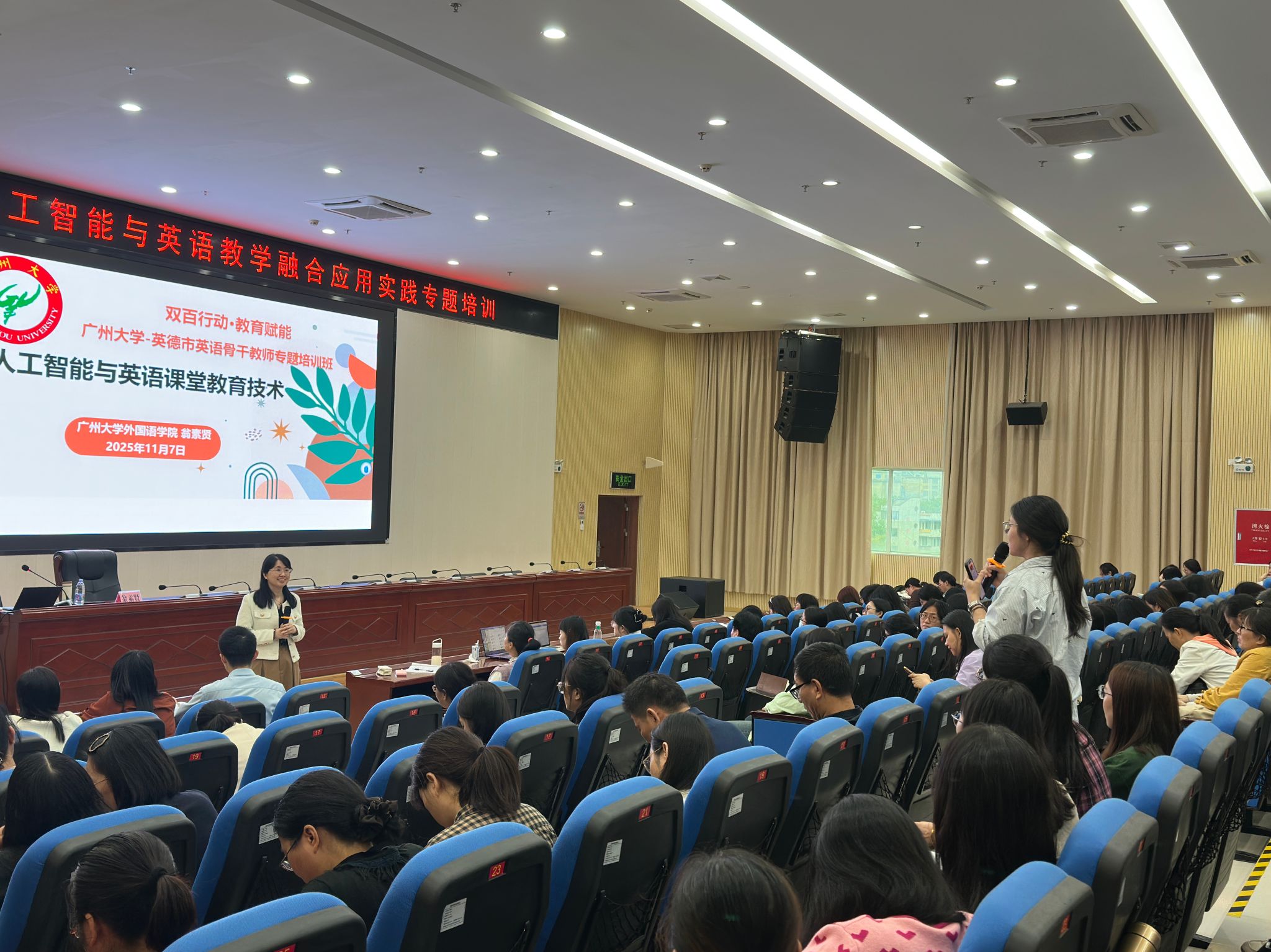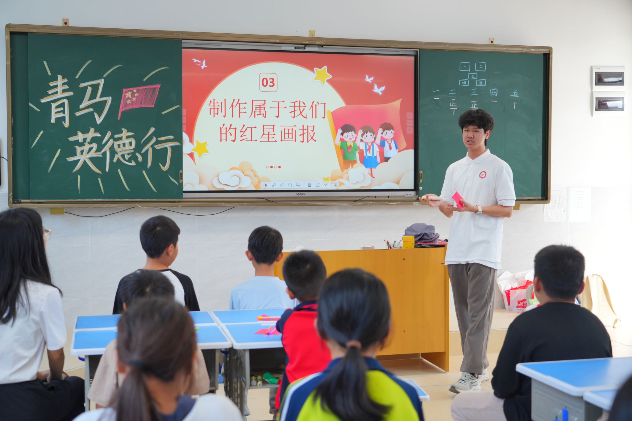 翁素贤老师带领学生共同面向英德市近300名中小学英语教师开展“人工智能与英语课堂教育技术”专题讲座,推动技术赋能地区教育提质增效。在英德市青少年宫与英红镇第三小学,学生们以“小通讯员潘冬子的故事”为主题联合开展红色公益课堂,通过情景剧、互动问答与手工制作等形式,引导当地青少年传承红色基因。在英红镇红卫社区,“龙腾茶乡情·青马筑初心”文艺汇演成功举办,党团青马成员同台演绎舞狮、歌舞、红歌等节目,以文化展演助力乡村精神文明建设。